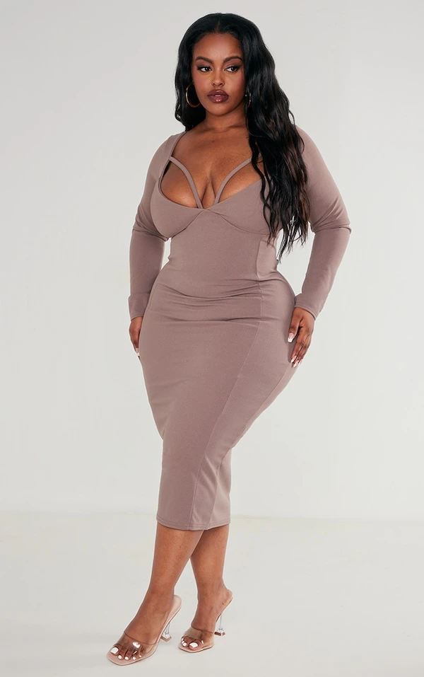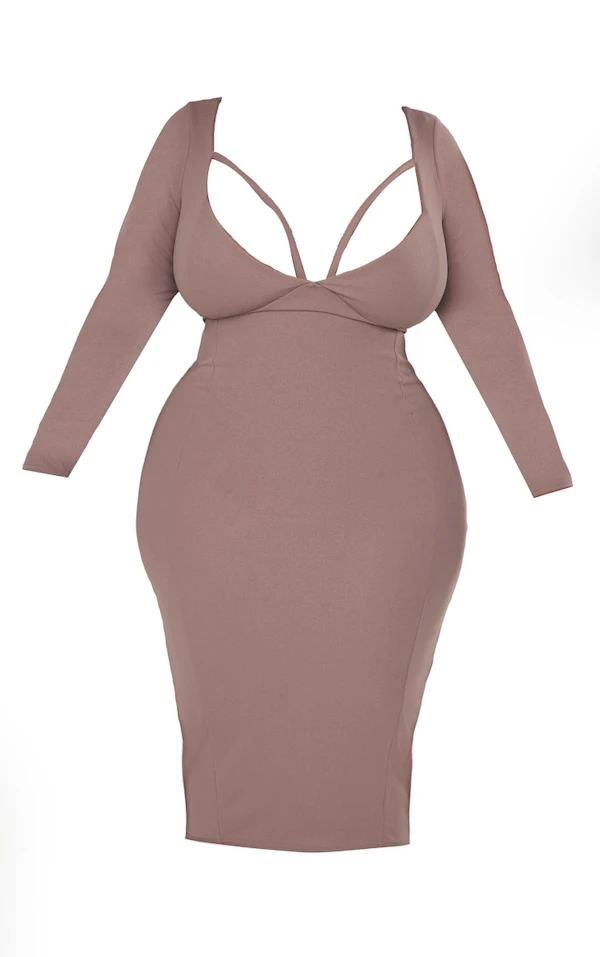 Plus Robe mi-longue taupe à bretelles et manches longues