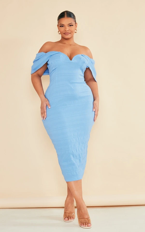 Plus Robe mi-longue texturée bleue à col bardot