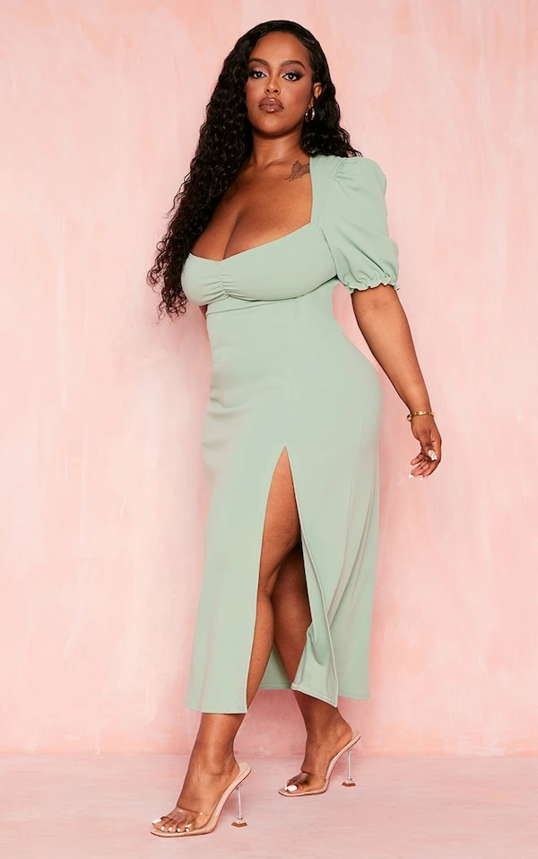 Plus Robe mi-longue vert sauge à manche bouffantes