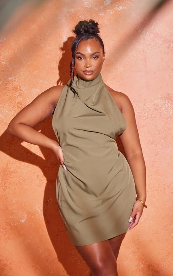 Plus Robe moulante dos nu kaki à col montant bénitier