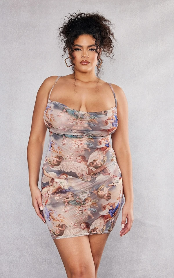Plus Robe moulante en mesh multicolore imprimé Renaissance à col bénitier