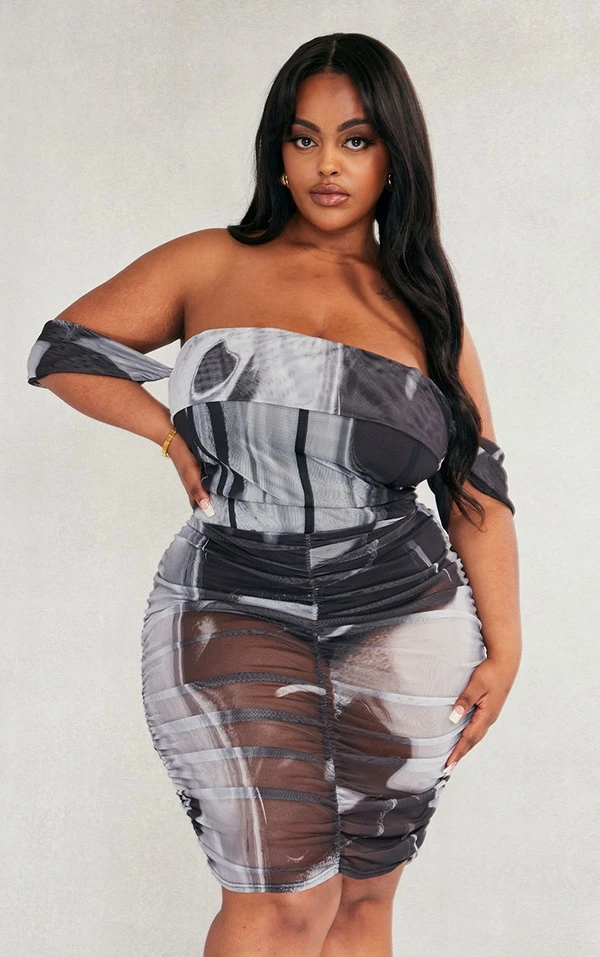 Plus Robe moulante froncée noire en mesh imprimé fumée abstraite à col bardot