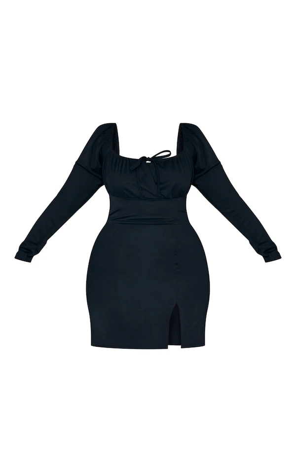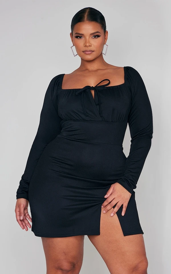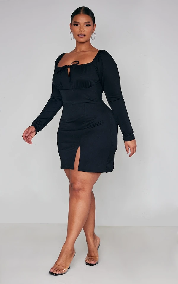 Plus Robe moulante noire nouée devant à manches bouffantes