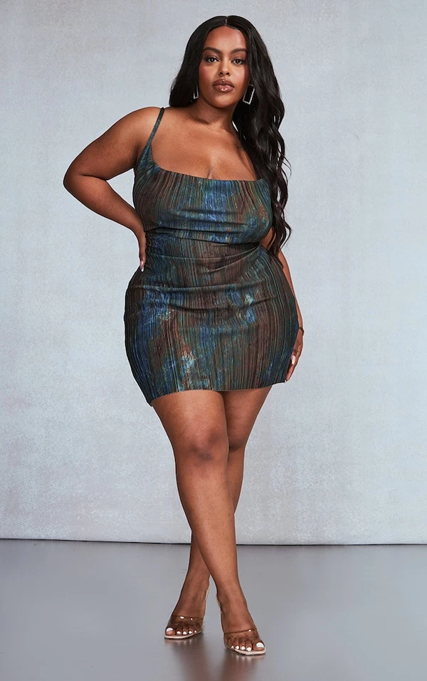Plus Robe moulante plissée marron à imprimé marbré et col bénitier