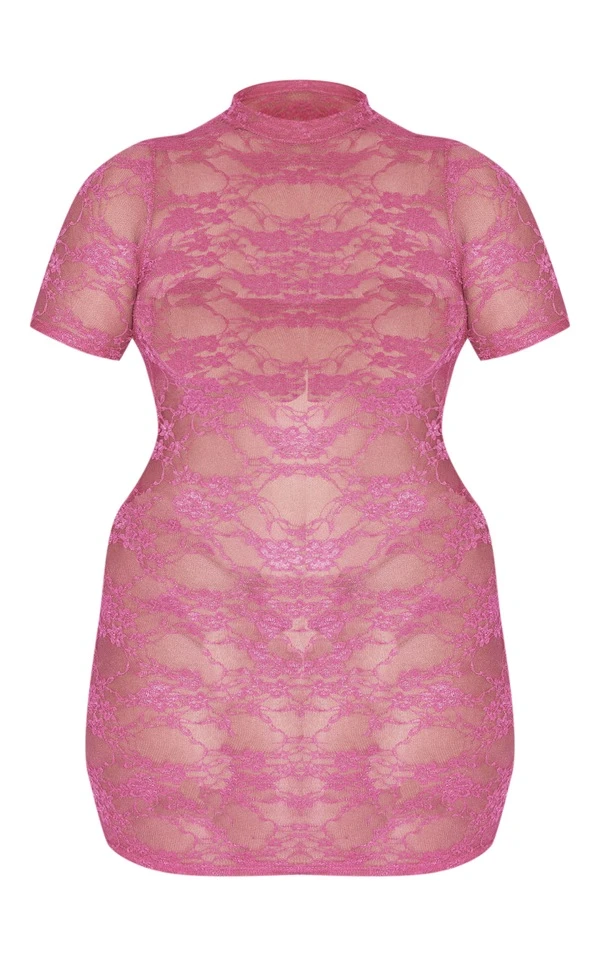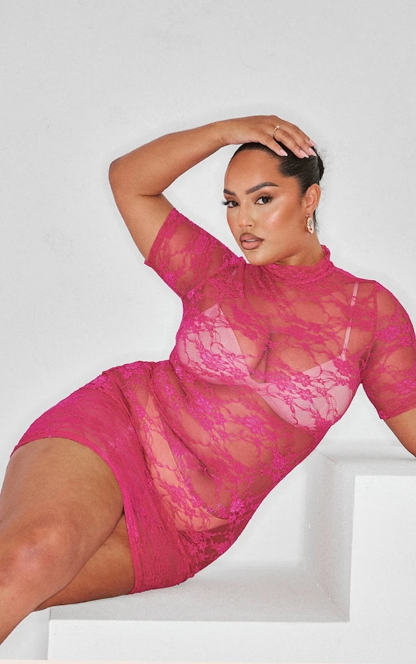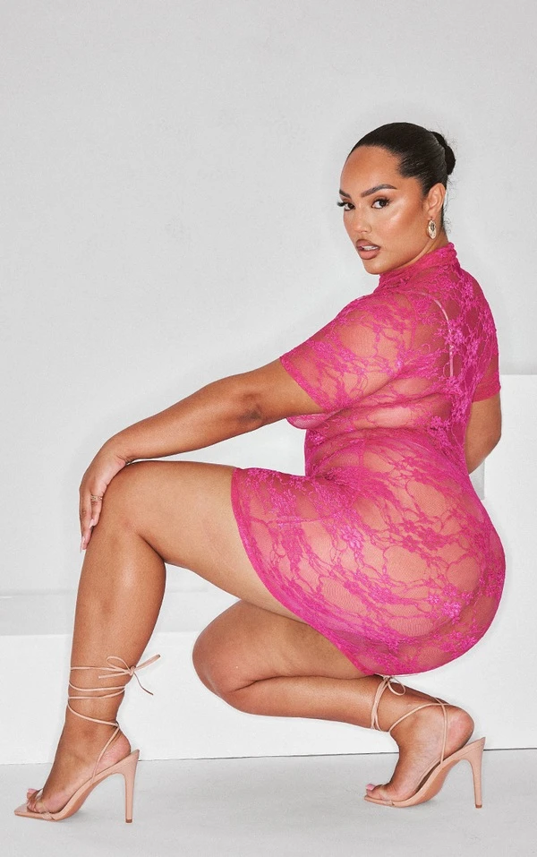 Plus Robe moulante rose en dentelle fleurie à col montant