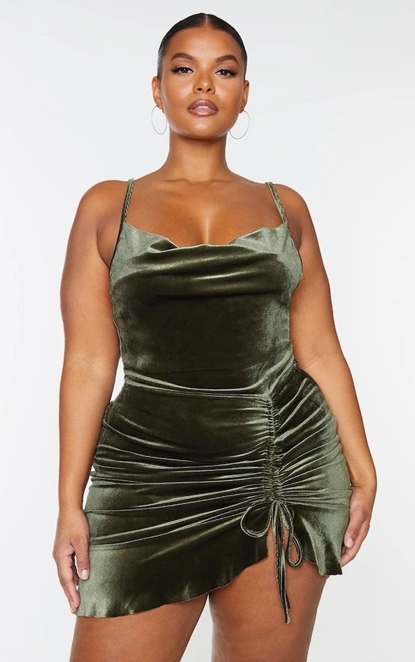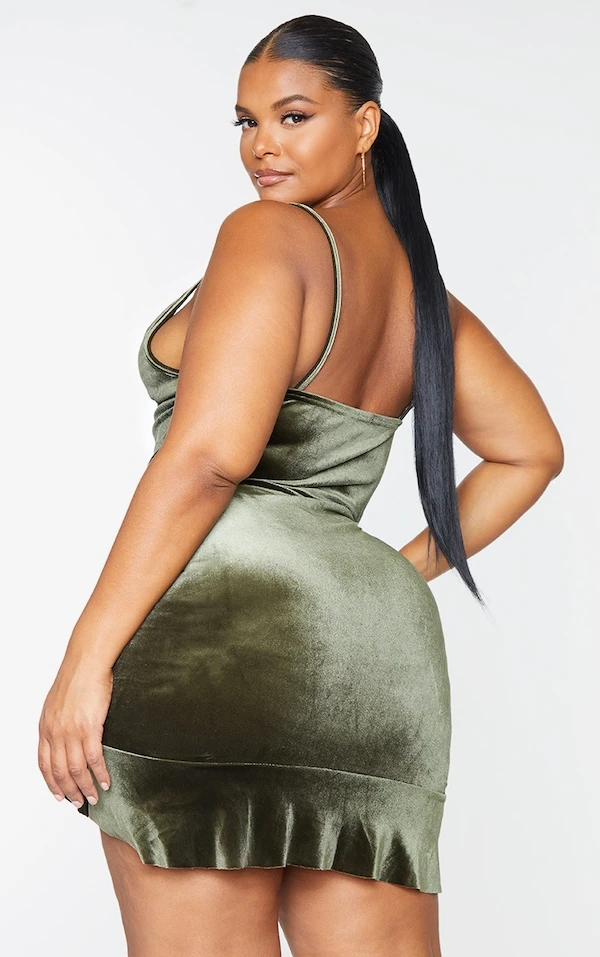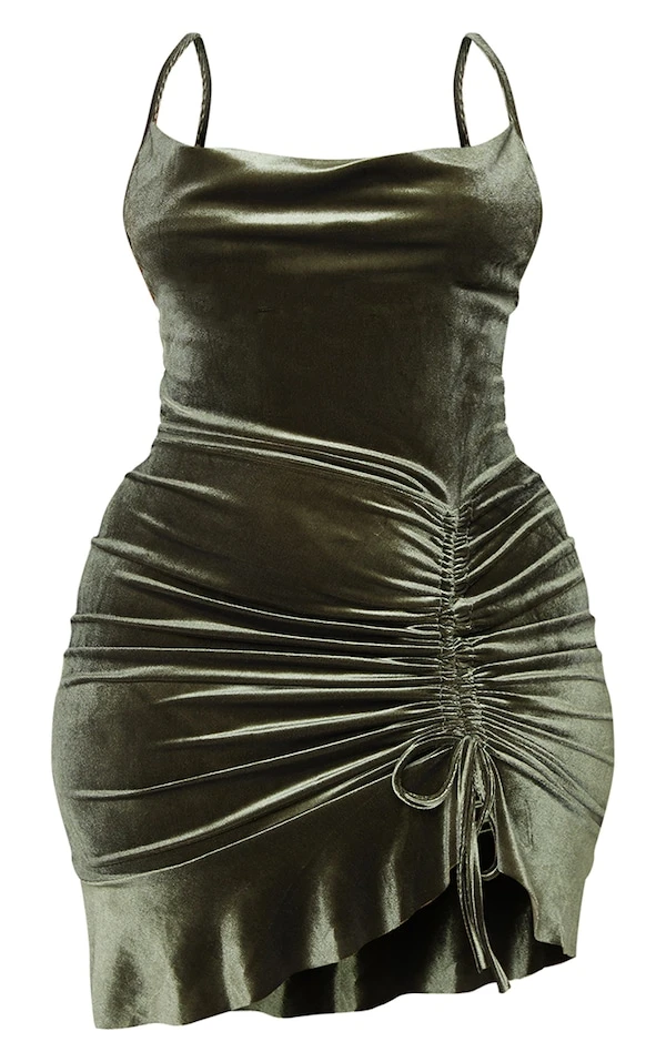 Plus Robe moulante volantée en velours vert olive à bretelles et fronces