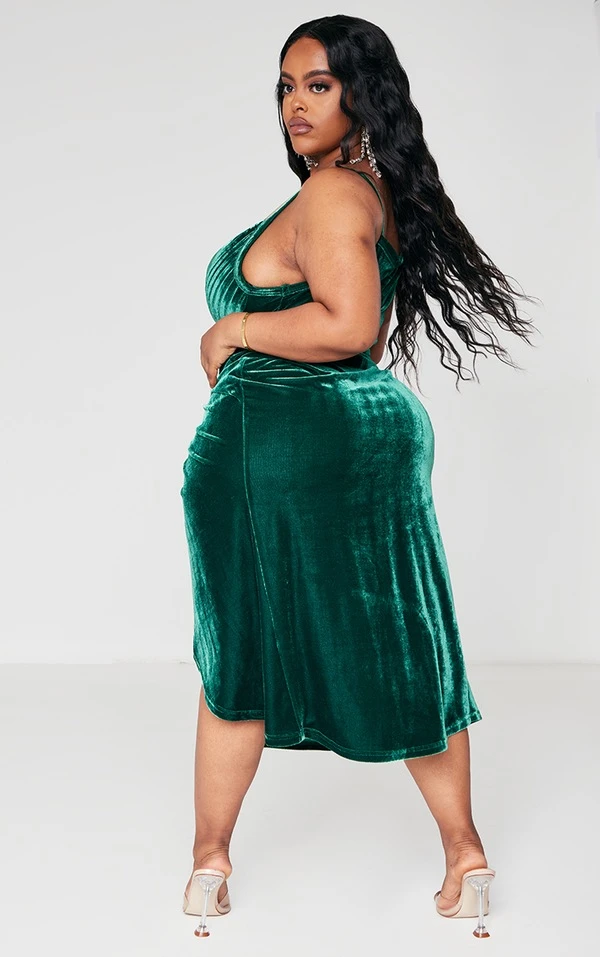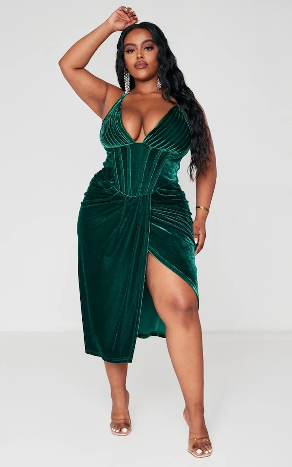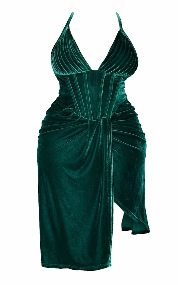 Robe moulante en velours vert émeraude décolletée à détail corset