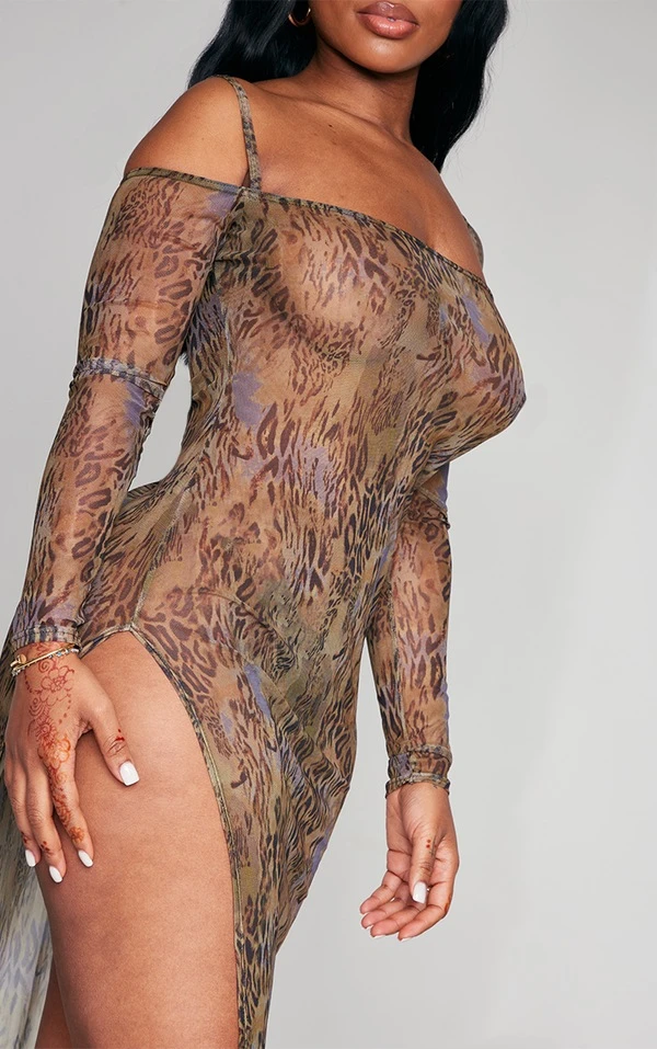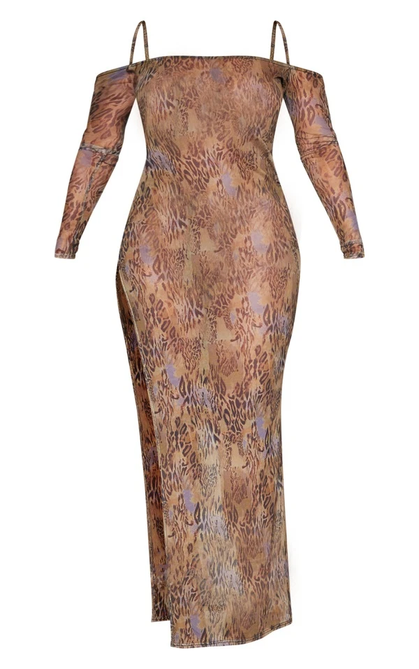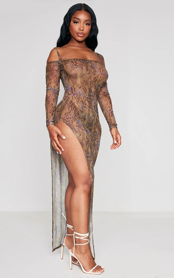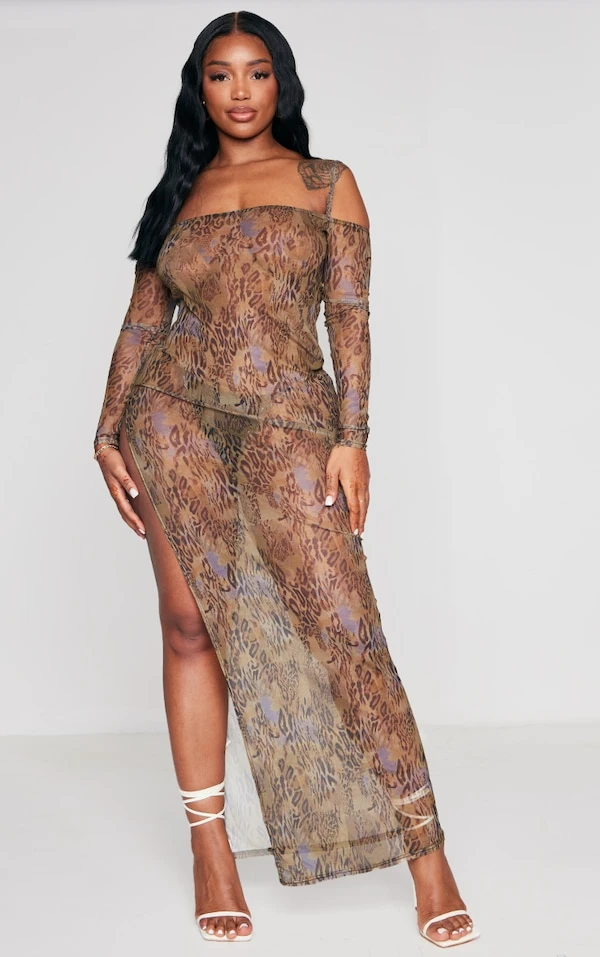Shape Robe longue en mesh imprimé marron à épaules dénudées