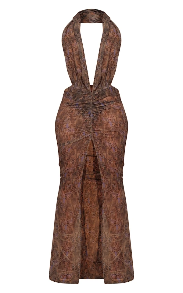 Shape Robe longue en mousseline de soie à imprimé léopard marron drapée devant