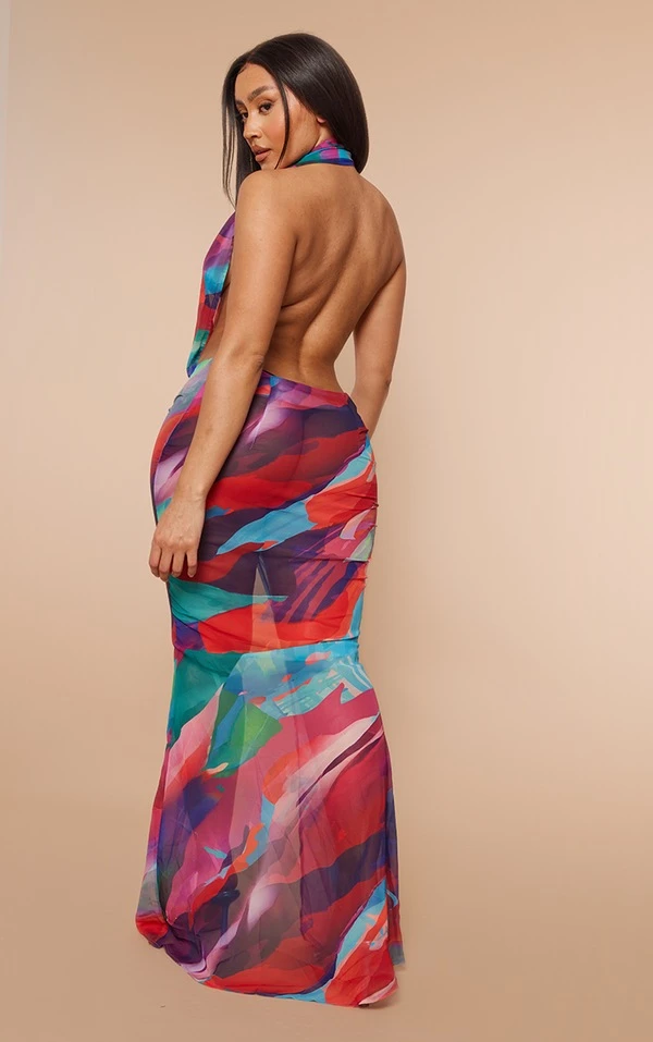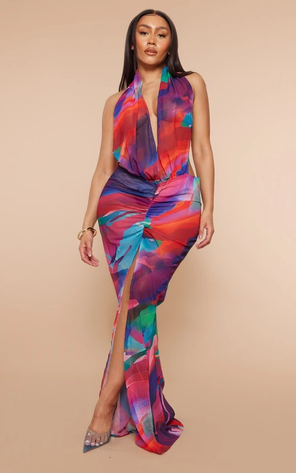 Shape Robe longue en mousseline de soie à imprimé multicolore drapée devant