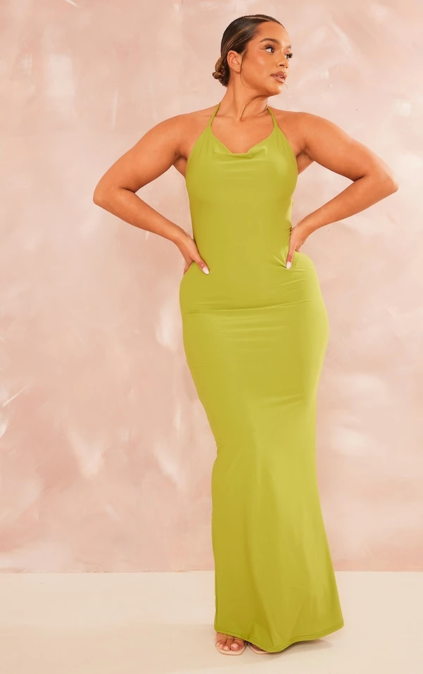Shape Robe longue moulante dos nu arrondi vert olive froncée à bretelles et col bénitier