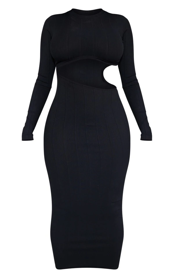 Shape Robe longue noire en bandage côtelé à manches longues et découpe