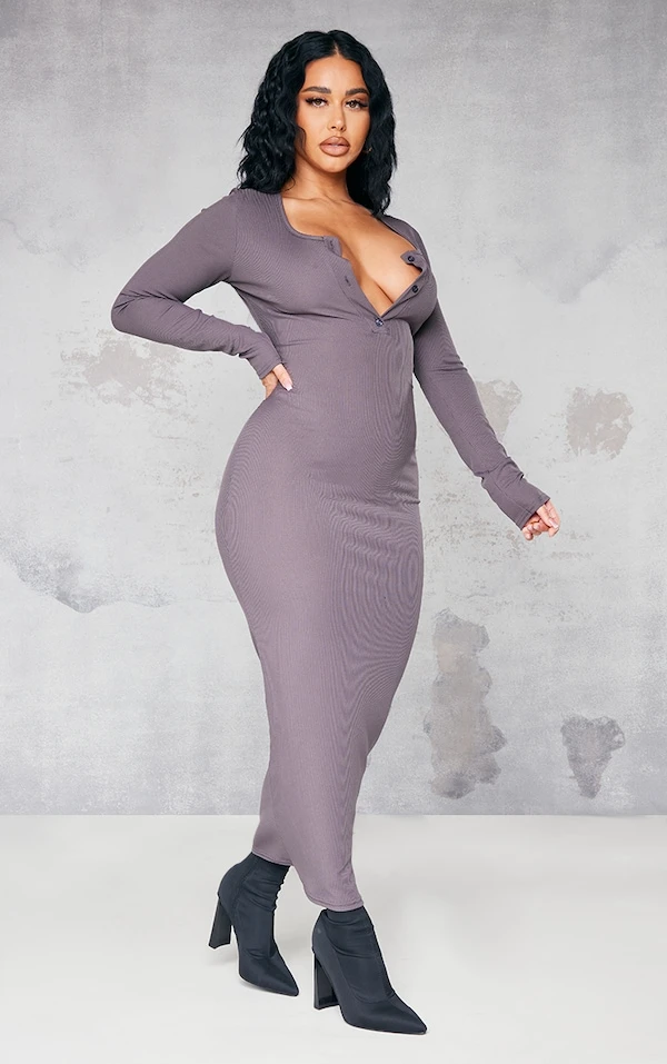 Shape Robe mi-longue anthracite côtelée à manches longues et boutons à l’avant