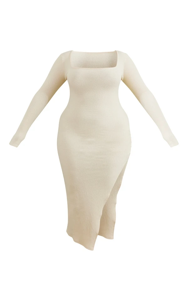 Shape Robe mi-longue côtelée brossée crème fendue à col carré