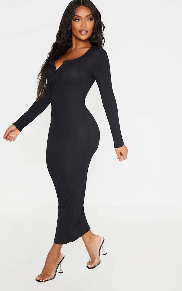 Shape Robe mi-longue côtelée noire à boutons et manches longues