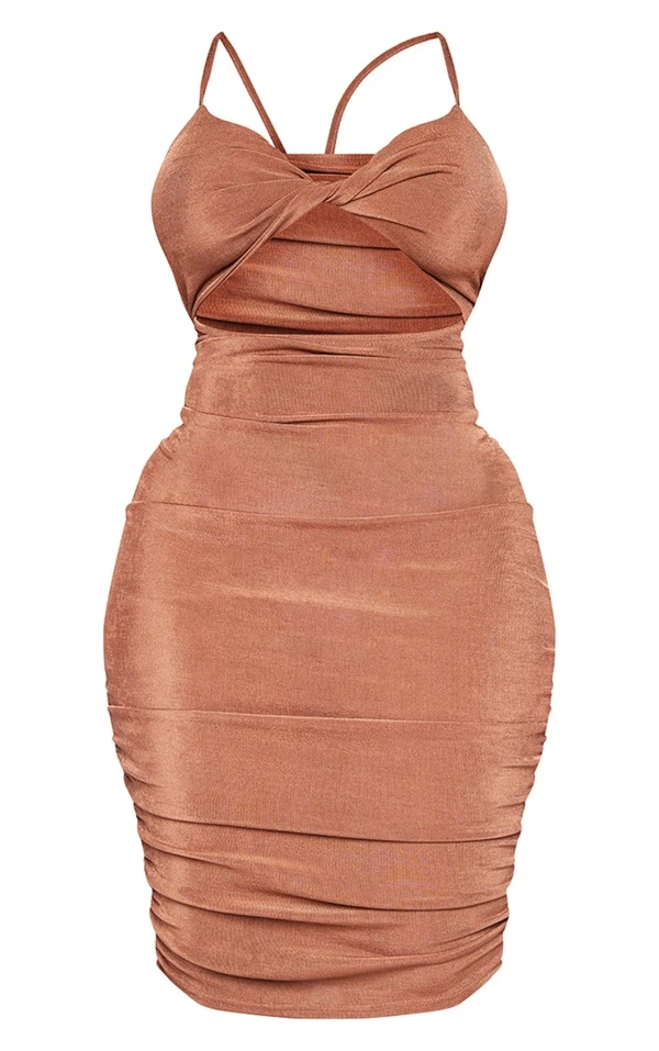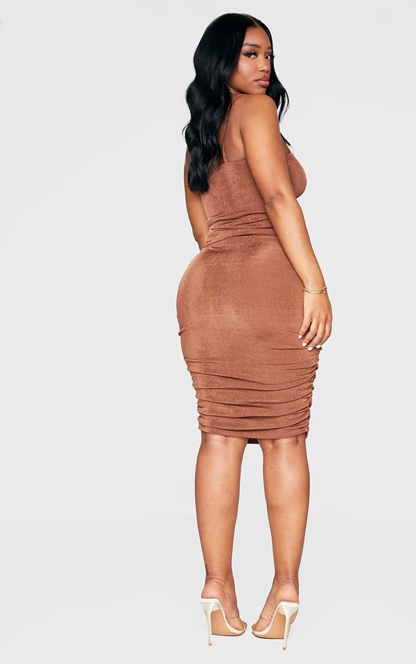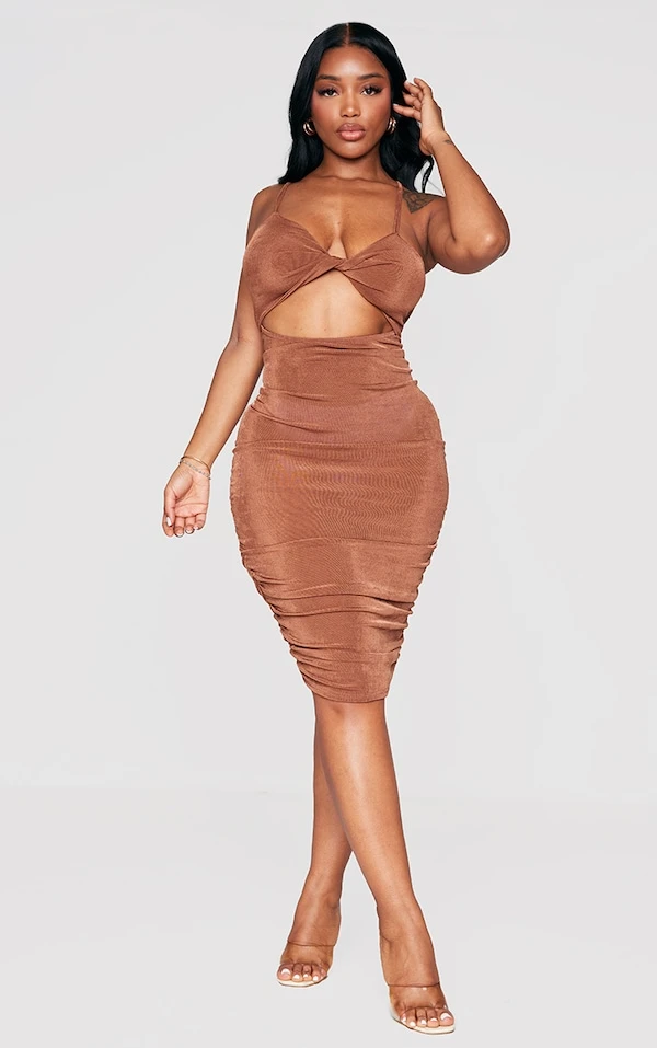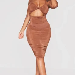 Shape Robe mi-longue moulante marron chocolat torsadée en acétate froncé