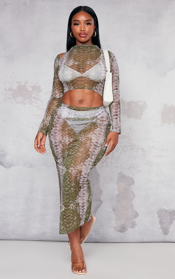 Direct dans le panier cette robe à la coupe mi-longue ! On adore son coloris vert très canon, sa matière en mesh délicate et son imprimé super stylé. Plus qu’à enfiler un bel ensemble de lingerie et une paire de mules transparentes. On est hyper fans.