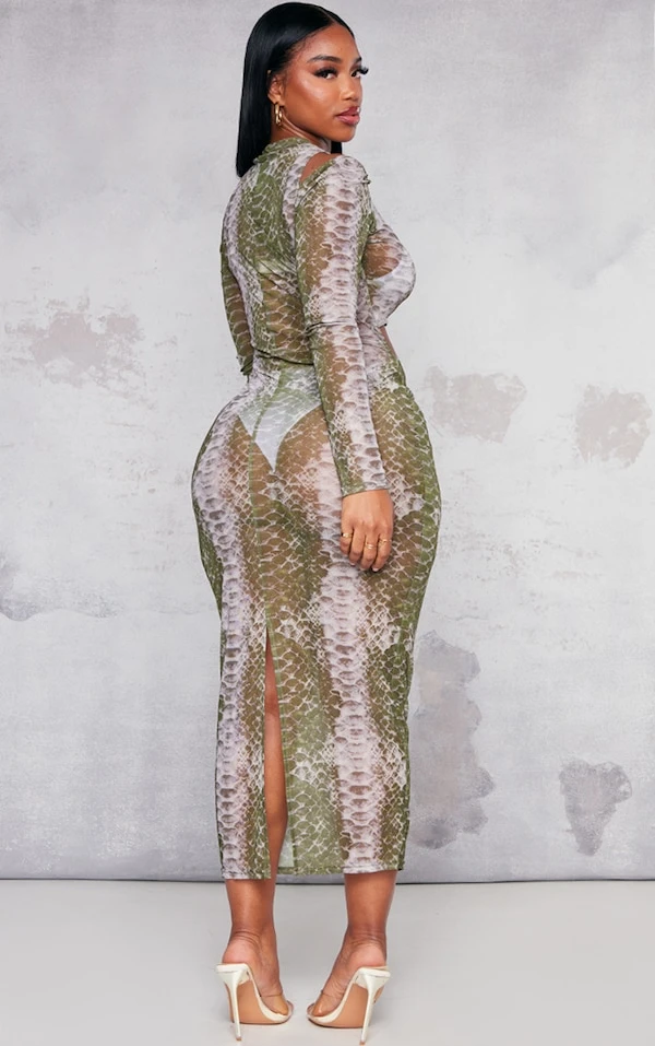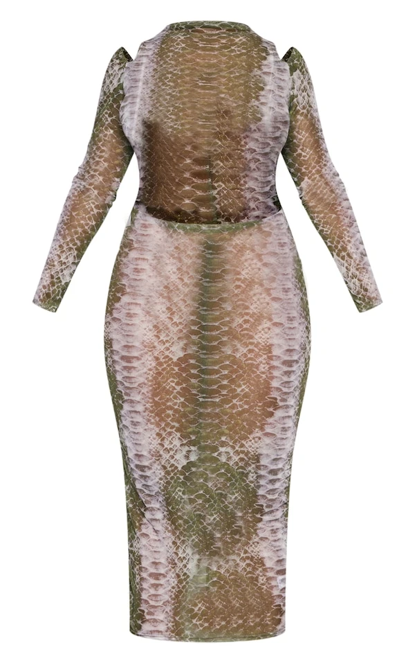 Shape Robe mi-longue verte en mesh imprimé à col montant et découpe