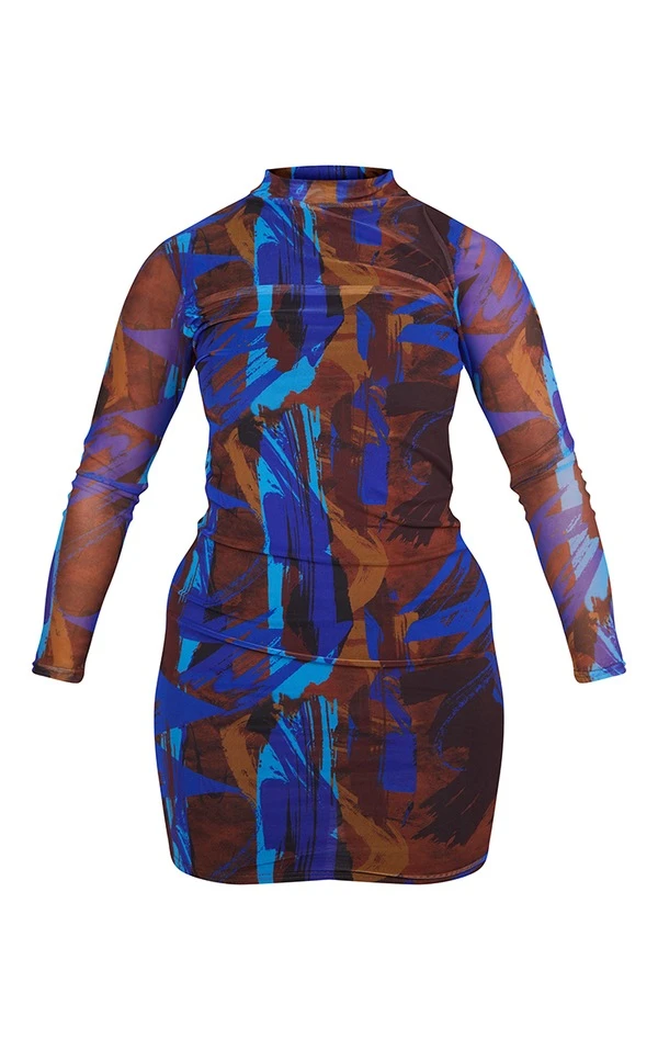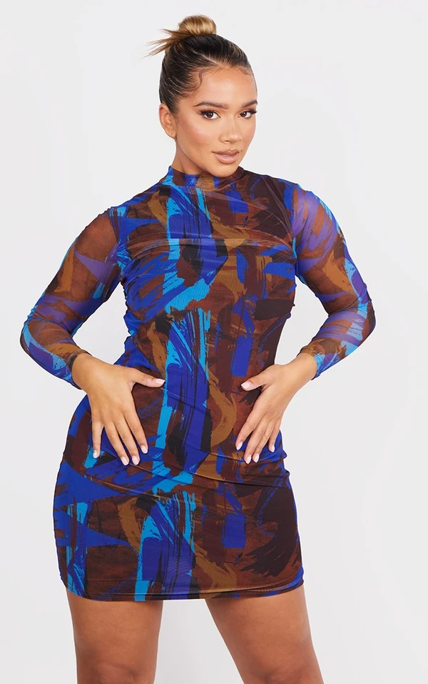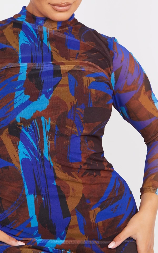 Shape Robe moulante bleue en mesh imprimé abstrait à col haut