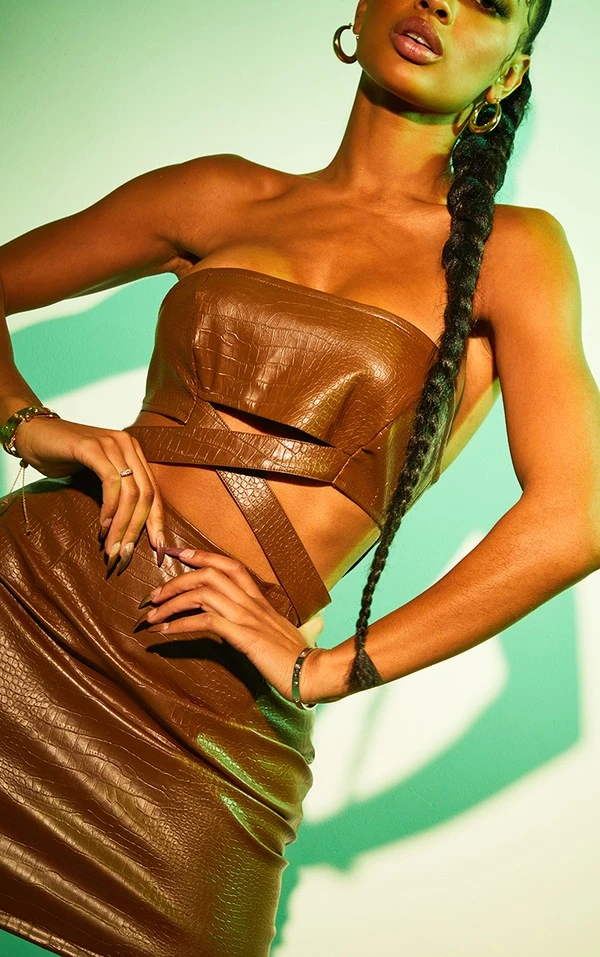 Trop belle la robe moulante ! Avec son similicuir marron chocolat, son effet à relief et son design découpé, c’est impossible de résister. Il ne manque que des talons et une paire de créoles !