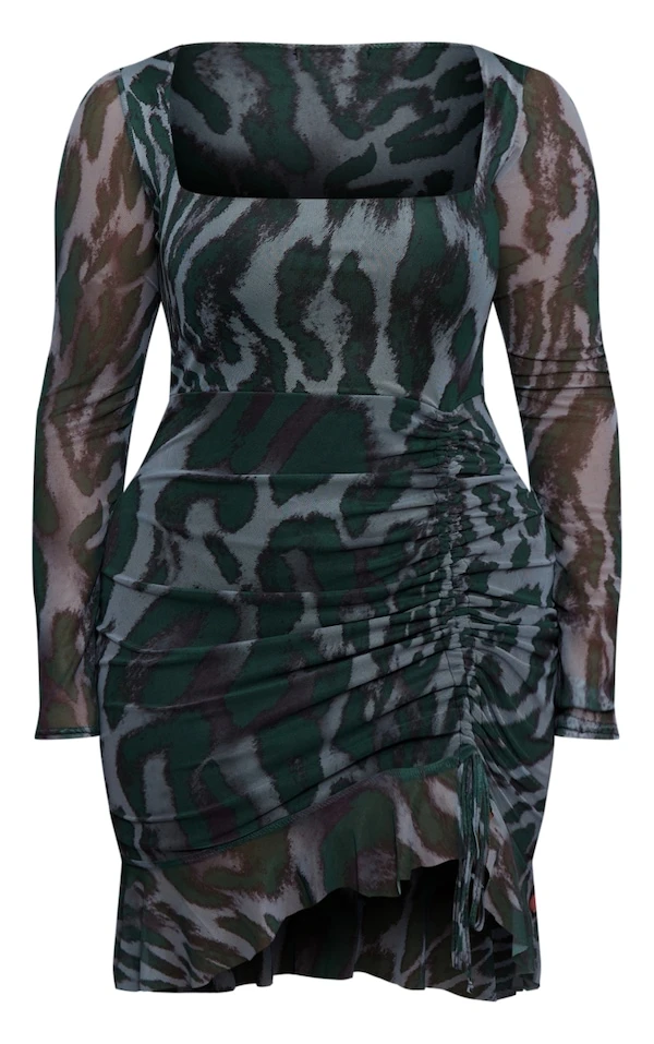 Shape Robe moulante imprimé abstrait vert en mesh manches longues froncée sur le côté à ourlet volanté