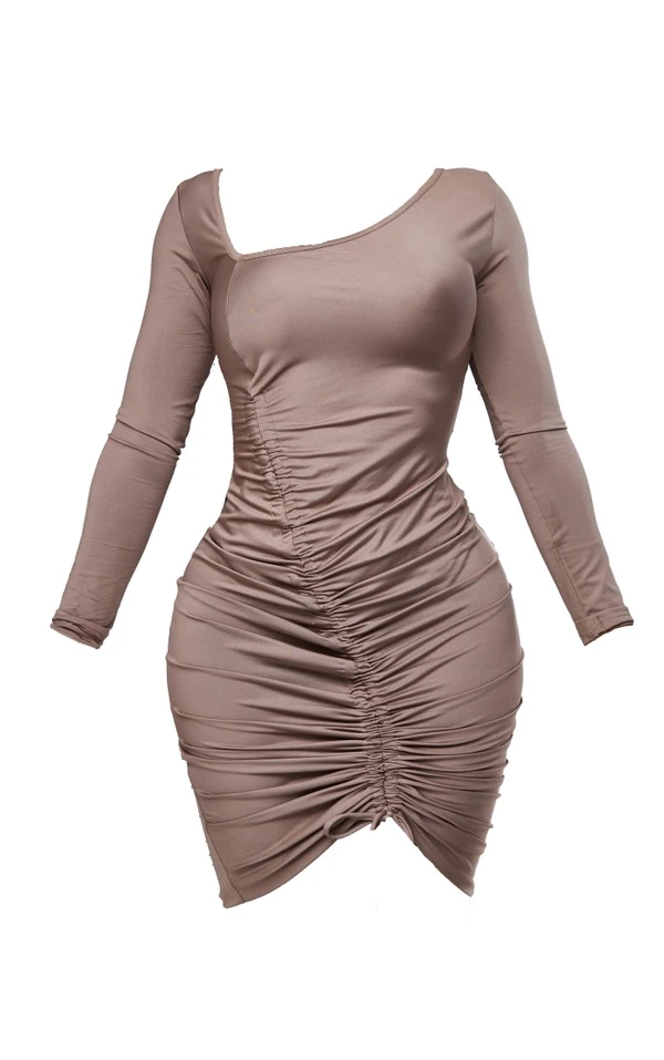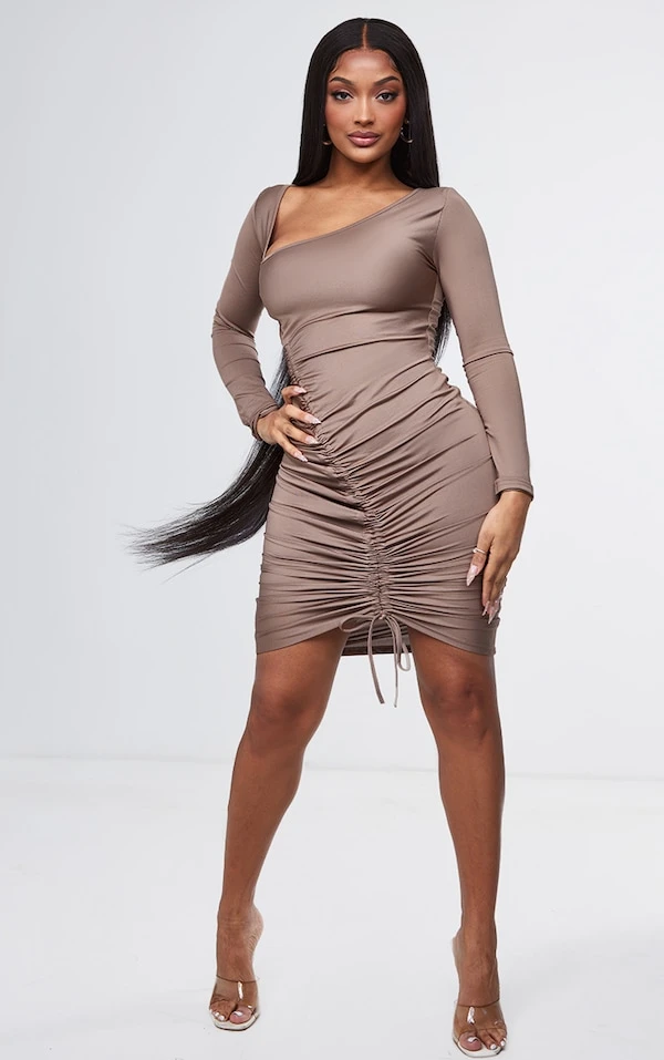 Douce et magnifiquement stylée dans cette robe ! Sa coupe moulante est magnifique et on adore son coloris taupe et son design à col asymétrique froncé. Elle se porte avec une paire de talons hauts et des créoles XXL. Trop belle !