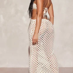 Tall Robe longue en maille crochetée bleu turquoise à dos nu
