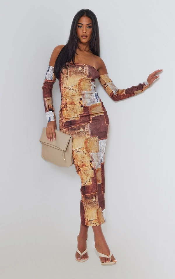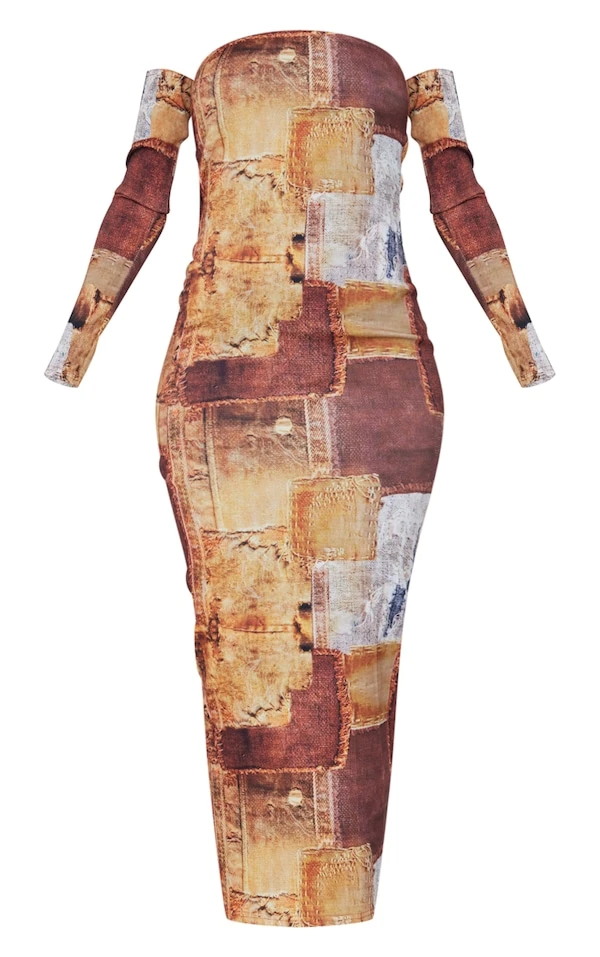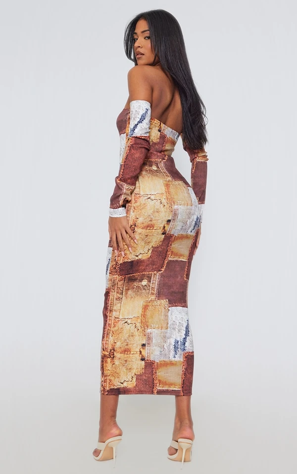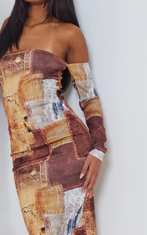 Tall Robe mi-longue marron à imprimé jean et épaules dénudées