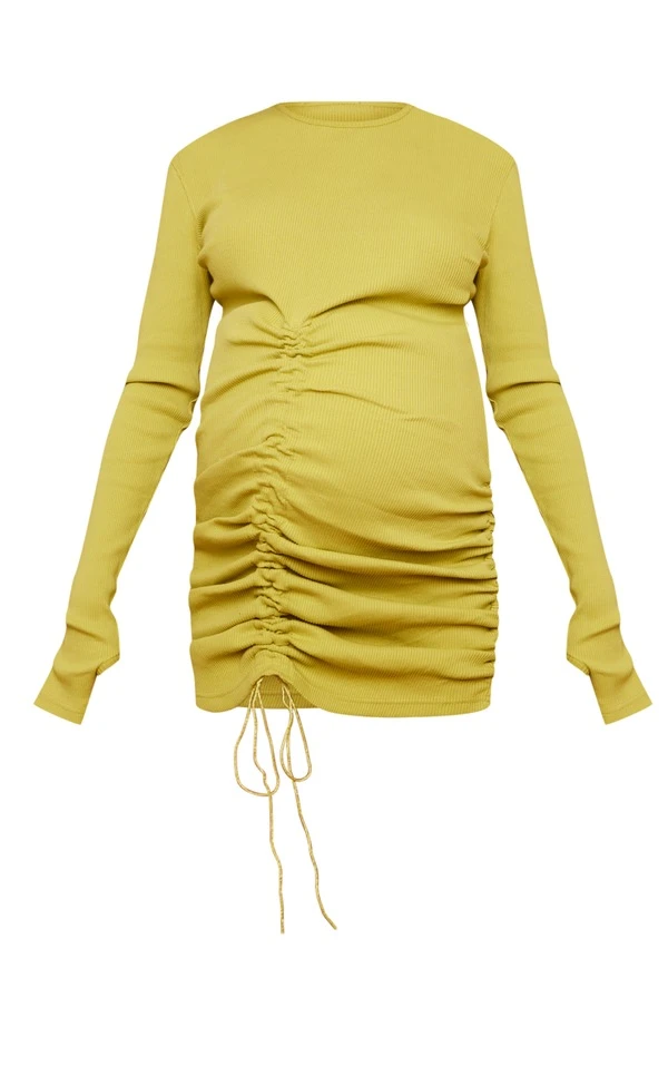 Maternité Robe de grossesse moulante chartreuse côtelée à manches longues et devant froncé
