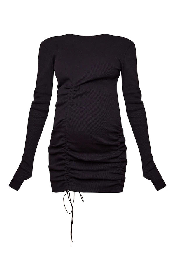 Maternité Robe de grossesse moulante noire côtelée à manches longues et devant froncé